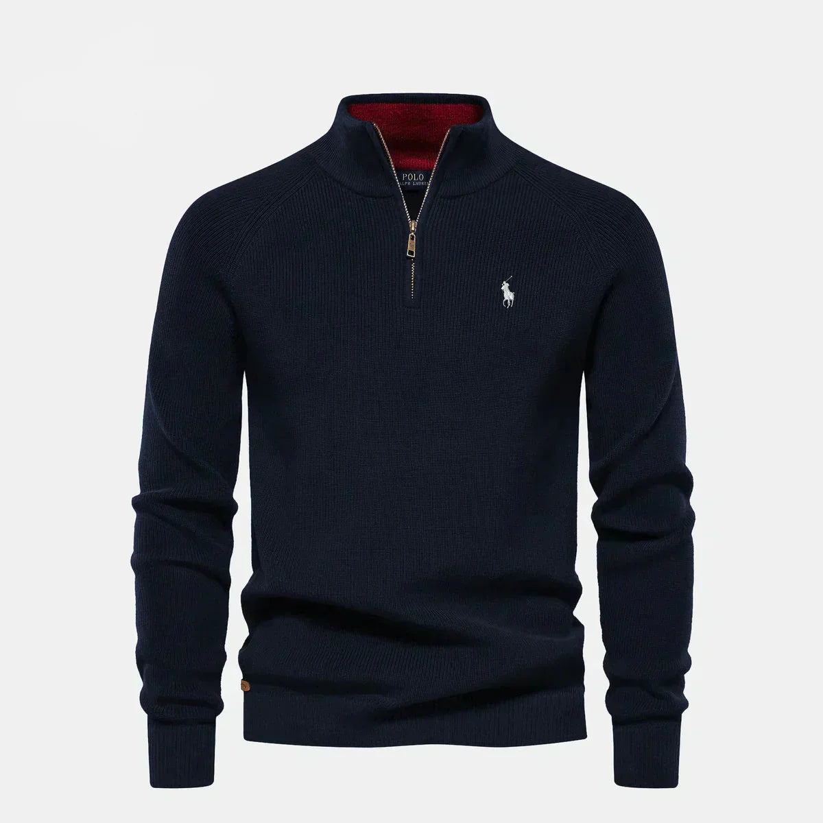 Discover this men's zip-neck sweater, designed for those who value both elegance and comfort. With its slim fit and ribbed fabric, this sweater offers a modern look while ensuring optimal comfort. The durable zipper and carefully crafted details are a testament to its exceptional finish.